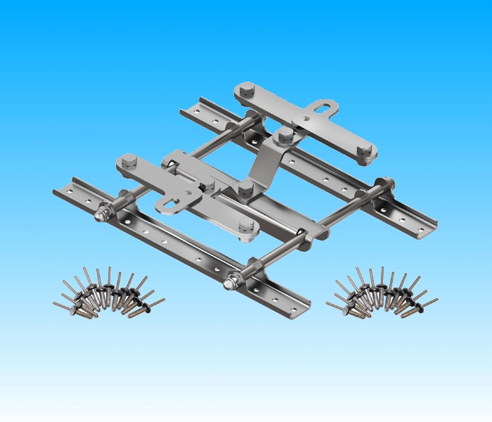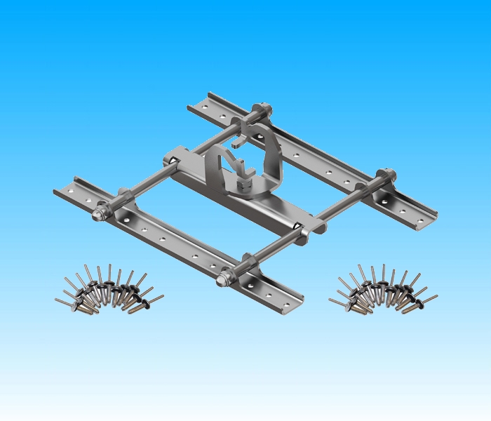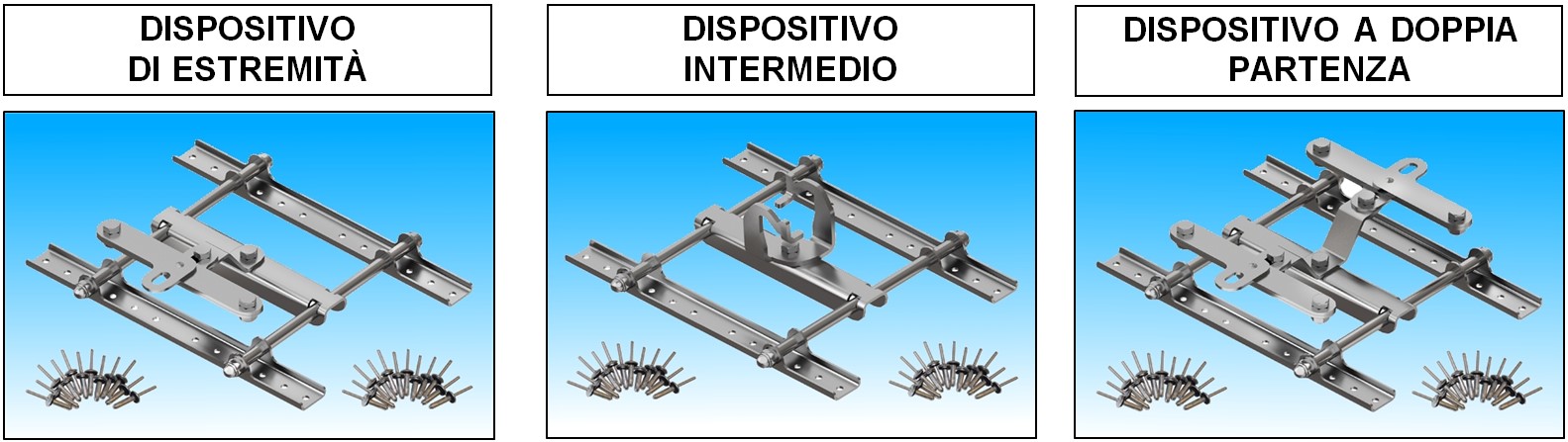 – Dispositivi di ancoraggio di estremità e intermedi CLMxx per linee di ancoraggio flessibili, con campata massima di 15 metri, minima di 2 metri e tratta massima consigliata 60 metri, specifici per fissaggio su pannello di lamiera grecata, comprensivi di rivetti per il fissaggio (24 rivetti strutturali in alluminio Ø 7,7 x 27,7 mm).