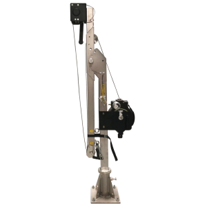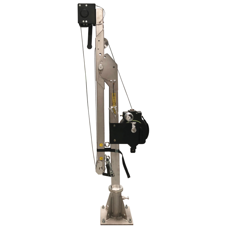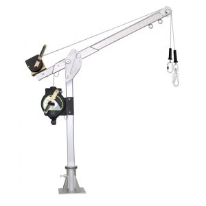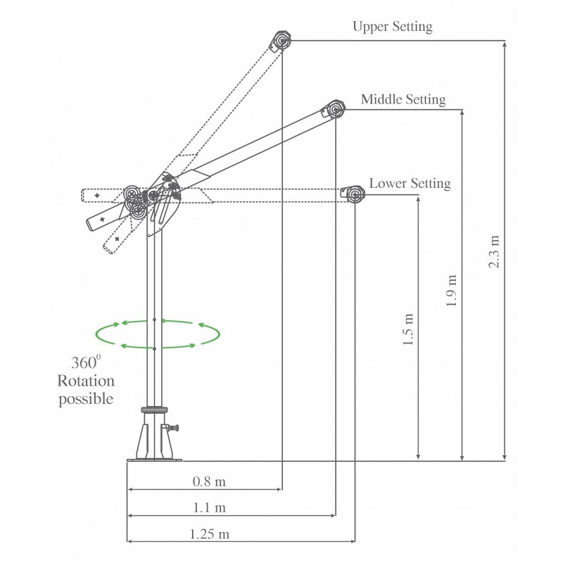 – Braccio regolabile a 3 altezze predefinite 2,3m/1,9m/1,5m, che può essere piegato lungo il piede ed attaccato con una cinghia per facilitare il trasporto della gruetta.
