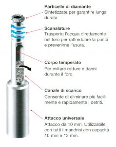 – Rappresentano la soluzione più efficiente ed efficace per forare in modo rapido e pulito materiali estremamente duri e resistenti come piastrelle, granito, gres porcellanato e pietra.