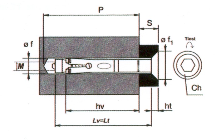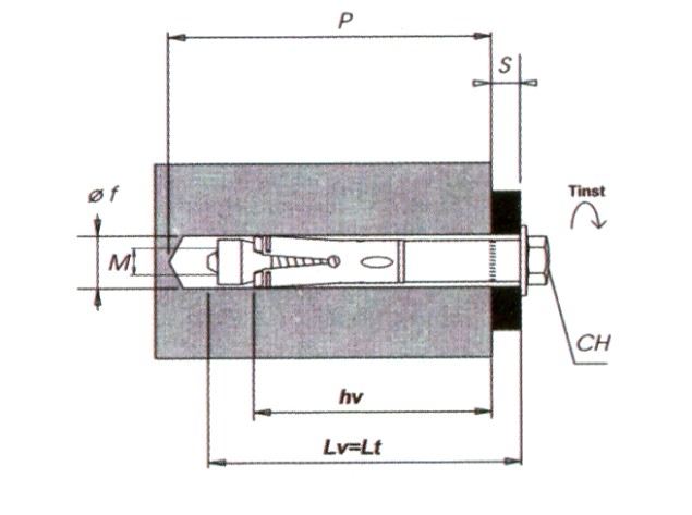 M=filettatura metrica; Øf=diametro foro; P=profondità foro; S=spessore fissabile; Lv/Lt=lunghezza vite, lunghezza tassello; CH=chiave; Tinst=coppia di serraggio;
