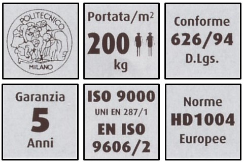 – Portata max: 200 kg/m2 (comprese due persone – piane e scalette esclusi).