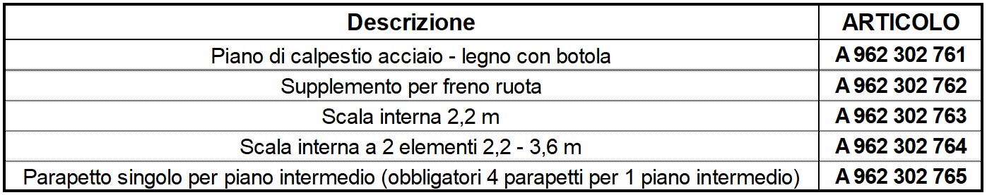 I codici sopraindicati si riferiscono al trabattello in fig.1,ovvero al modello base. Tutti gli accessori (piani, scale, ecc.) vengono forniti su richiesta, ed hanno i codici sottoindicati: