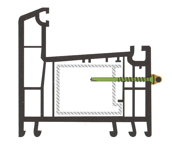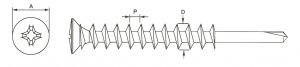 – Vite autoforante per infissi in PVC con testa piana svasata, specifica per il fissaggio di supporti per cerniere.
